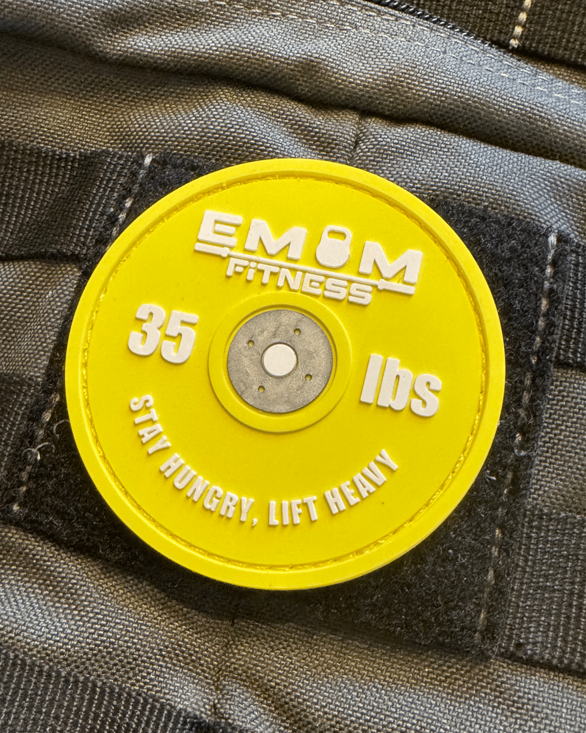 Bring Farbe in dein Training! Der Barbell Yellow Patch von EMOM Fitness ist das perfekte Accessoire für deine Gewichtsweste oder deinen Plate Carrier. Das auffällige Design in Form einer gelben Hantelscheibe mit „55 lbs“ Aufdruck und dem Slogan Barbell Therapy macht deine Ausrüstung unverwechselbar – ob beim Training, Outdoor oder im Gym.